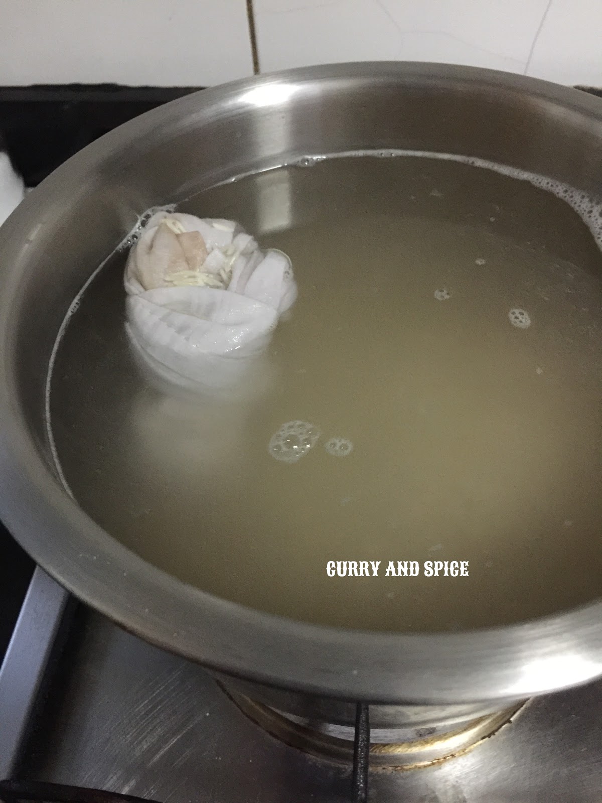 Tie the mentioned spices in a clean piece of cloth and drop it on a vessel with enough water.