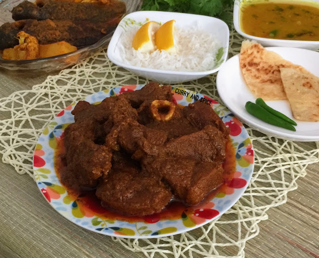 What did I mean by this "Coastal Style?"..... You see I have little knowledge about Food History! Hence in most cases I avoid talking about it.... Earlier I had blogged about some meat / egg dishes of Malvani / Konkani origin ..... what I see mostly is that they fry a couple of spices along with onion, grated coconut in oil and then blend them to a paste before proceeding with the recipe. Now this may vary from one region to another depending on the most available ingredients there. Isn't it so that the Southern India or this island or the Barishal district of Bangladesh use coconut extensively in their cooking because of it's easy availability? I remember this COASTAL STYLE MUTTON was done on a Saturday.... so neither  stepwise pictures were possible nor an authenticity of any particular region or place could be maintained. You all know that most of the time I prefer taking rough ideas from around and go ahead with a recipe unless it is a heirloom, Bengali family recipe.