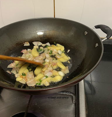 Heat the oil in a wok and straightaway add the sliced onion and chopped green chillies. Stir at high heat for 2-3 minutes.