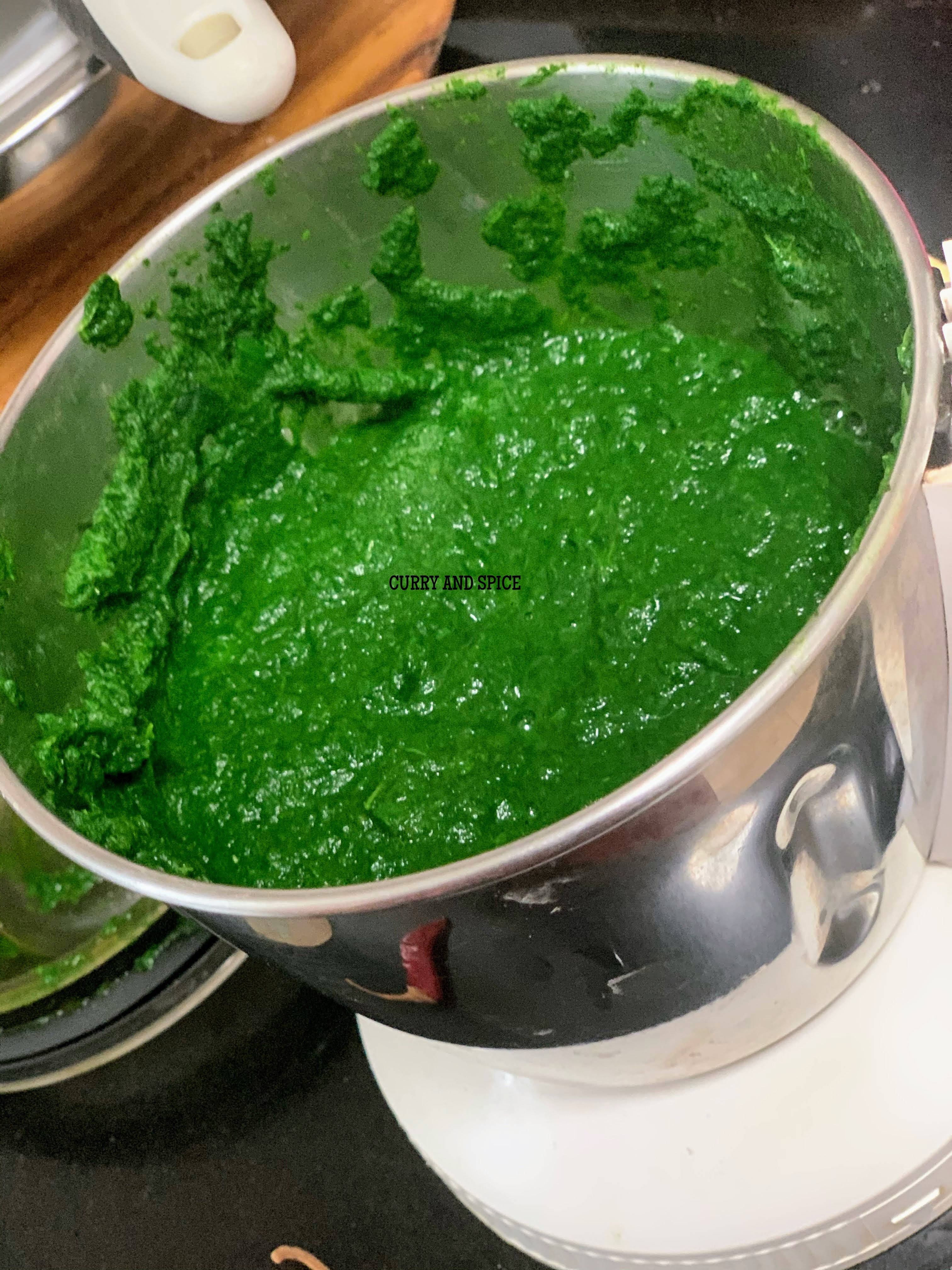 Once the onions turn translucent, we need to add the pureed mustard greens / shorshe shaak and palong / spinach.