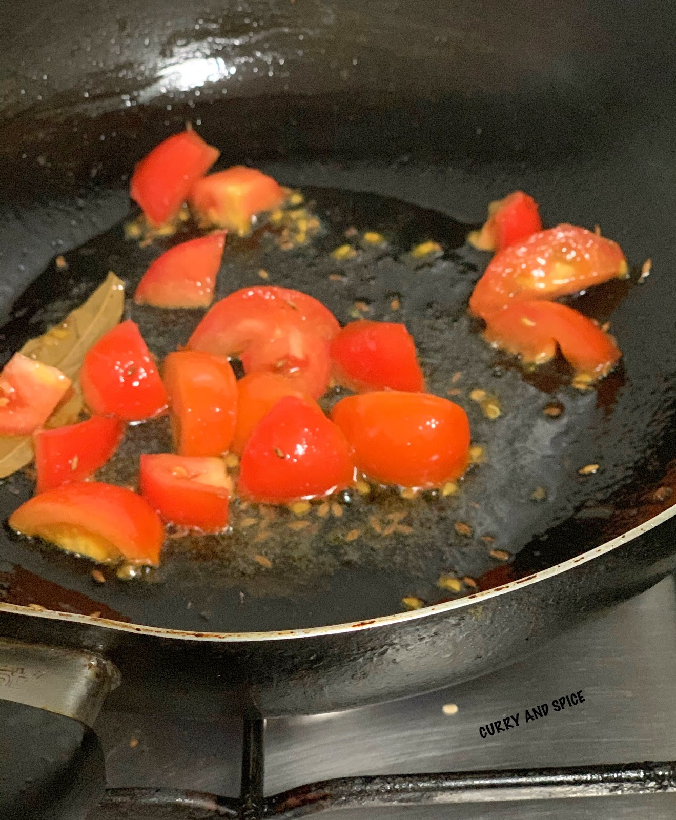 We have chopped the washed tomatoes. We have tempered the heated oil with the cumin seeds and bay leaf.