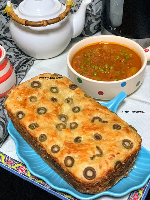 It is a bread I cooked on the gas top.I was in a hurry to visit the market, the yeast was not rising but the BREAD had to happen, else the BLUE CHEESE would spoil! I took a drastic step, jo bhi hoga dekha jayega! I mixed together everything, kneaded a dough, put the dough bowl inside the microwave and went out for 2-3 hours!At one point, I even forgot that I had left a bread dough for rising at home. I was roaming at Fair Price Xtra, searching for my lost trolley, a good frozen pizza, this and that! Once I found my trolley, I ran back home; I saw the yeast dough had risen so much that it touched the base of cover!Thereafter,I had this STOVE TOP VEGETARIAN BREAD done in an hour; beyond my expectations!I was happy!